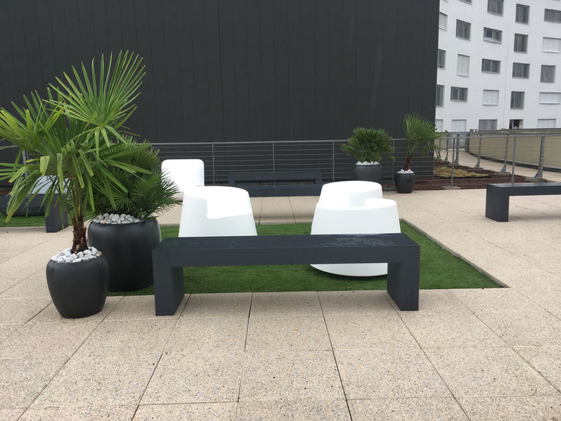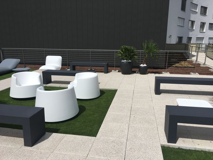 Aménagement d'un toit terrasse pour une résidence étudiante. Sapiac Office a choisi et installé du mobilier, des pots design ainsi que des plantes résistantes afin d’obtenir un espace extérieur moderne et facile d'entretien.