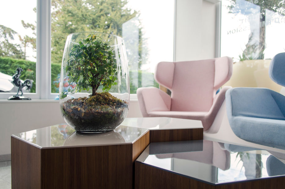 Création d'un espace d'attente et d'un bureau de direction contemporain aux lignes sobres et élégantes.